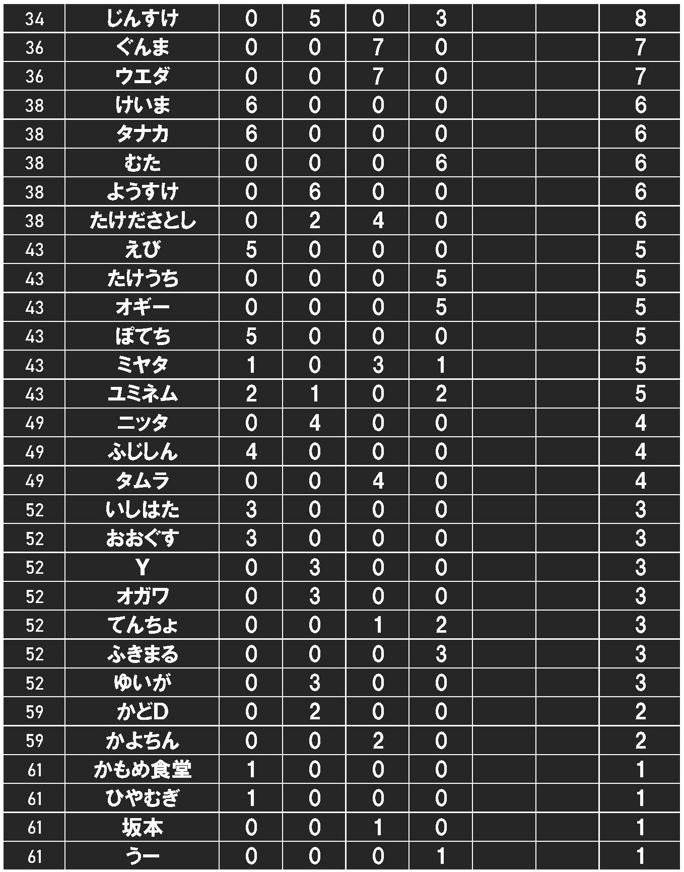 【ビギナー】 1位・2位・3位・4位・5位 5P・4P・3P・2P・1P